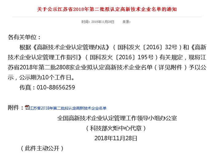 2018年11月28日,國家科技部全國高新技術(shù)企業(yè)認(rèn)定管理工作領(lǐng)導(dǎo)小組辦公室,通過科技部火炬中心官網(wǎng)發(fā)布——江蘇省2018年第二批國家級高新技術(shù)企業(yè)認(rèn)定名單的公示通知,南京凱基特電氣有限公司榜上有名,目前已順利通過公示,正式予以認(rèn)定!